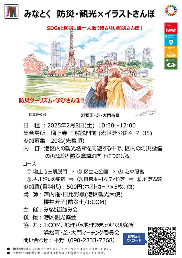 2025年2月8日(土)みなとく 防災・観光×イラストさんぽを行いました。今回のイベントは、J:COM様のご協力をいただき、港区を防災の視点で改めて注意しながら歩くことで、普段では気付かない危険個所や防災設備などを再認識し、防災意識の向上を図るとともに、観光名所を周遊することで、区内の伝統文化を知り、より深い学びにつながるのではと考えております。