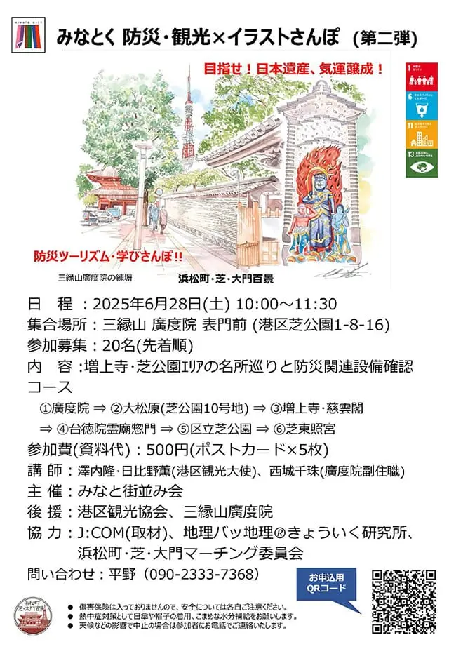 2025年6月28日(土)「みなとく 防災・観光 × イラストさんぽ(第二弾)」を行いました。当日は、江戸時代に建てられ関東大震災や東京大空襲を経て残る三縁山廣度院の練塀から芝公園にあるマンホールトイレなどの防災設備を百景イラストのロケーションポイントを交えて散歩をしました。