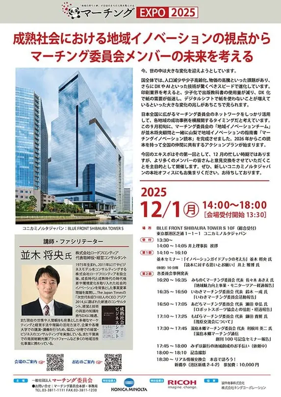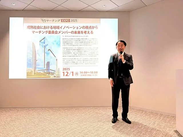 2025年12月1日(月)コニカミノルタジャパン10階セミナー室にて、マーチングEXPO2025を行いました。全国より40名の会員、関係者等が参加し 第1部は、並木将央氏による講演「イノベーションガイドブックの考え方」と理事長の井上雅博氏による「読本に対する思いとお願い」の後、第2部は5会員による各委員会事例発表とみずほ銀行様からは 「みずほ銀行の地域創成のお手伝い」のプレゼンをしていただきました。