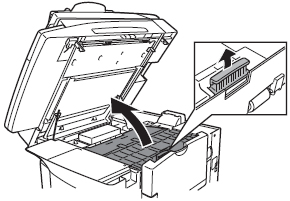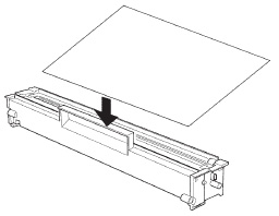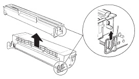 ドラムカートリッジの感光体(緑色の箇所)に光が当たらないように、紙、布などでおおいます。