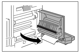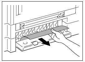 本機の給紙ユニット横カバーを開き、用紙をゆっくり引き抜いてください。
