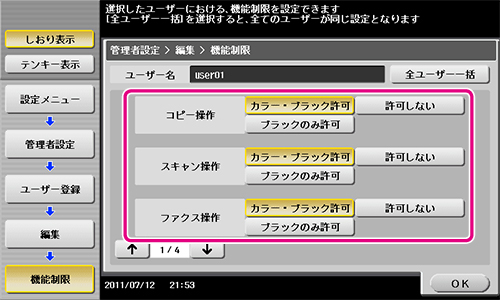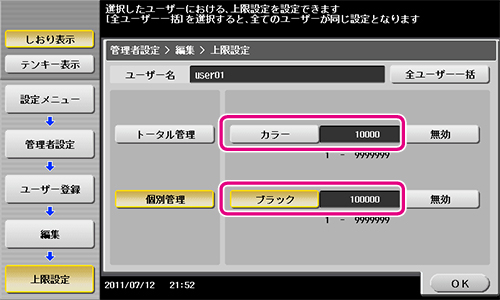 ユーザーが印刷できるカラー原稿およびブラック原稿の上限値をテンキーで入力します。