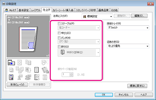 [ステープル]、[パンチ]、[折り] をチェックした場合は、数や位置などを選びます。