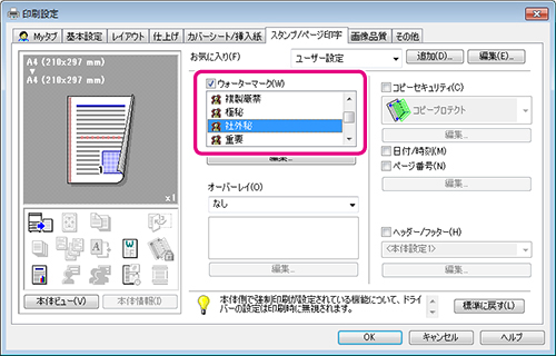 3 [スタンプ/ページ印字] タブの[ウォーターマーク] をチェックして、ウォーターマークを選びます。
