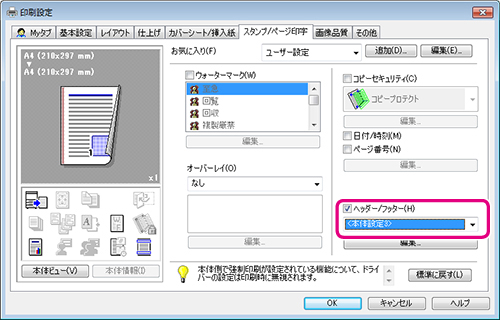 3 [スタンプ/ページ印字] タブの[ヘッダー/ フッター] をチェックして、印刷する情報を選びます。