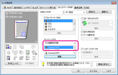 [オーバーレイ] から[PCの画像を印刷]を選び、オーバーレイ用のファイルを選びます。