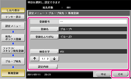 4 グループ宛先の各項目を設定し、[OK] をタップします。