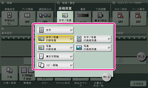 3 [応用設定] をタップして[原稿画質] を選び、読込む原稿の内容にあった画質を選びます。