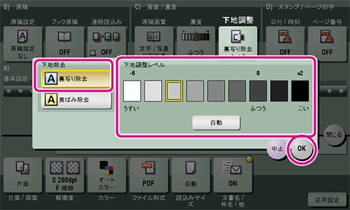 4 [裏写り除去] をタップし、裏写りのレベルを設定して、[OK] をタップします。
