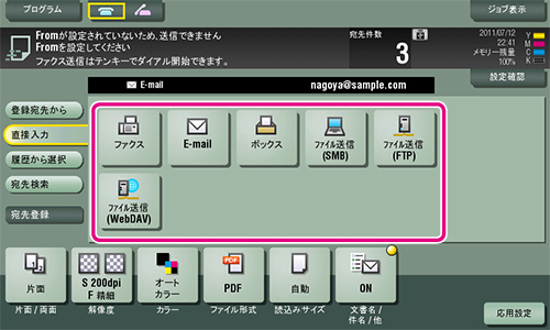 2 [ファクス/スキャン] をタップし、[直接入力] から宛先の種類を選びます。