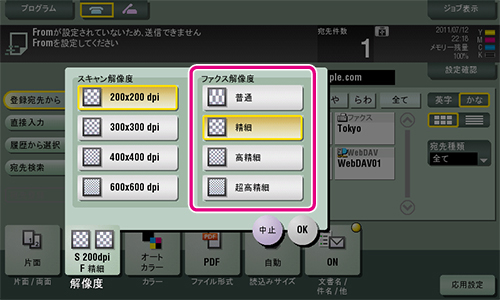 原稿を送信するときに解像度(きめ細かさ)を設定する方法と、原稿の内容に合わせた画質を指定する方法があります。