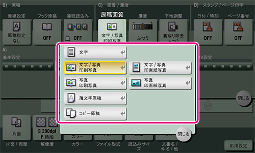 3 [応用設定] をタップして[原稿画質] を選び、送信する原稿の内容にあった画質を選びます。