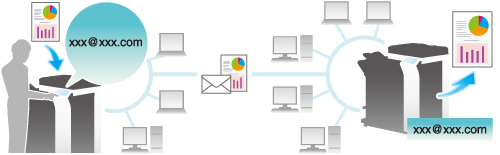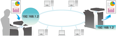 イントラネット内では、IPアドレスファクスを利用できます。IPアドレスファクスは送信先ファクスのIPアドレス、ホスト名、メールアドレスのいずれかを指定して、相手に直接ファクスを送信できます。メールサーバーは必要ありません。