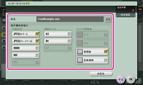 3 [宛先] に送信先のメールアドレスを入力し、[相手機受信能力] で相手機が対応している圧縮形式、用紙サイズ、