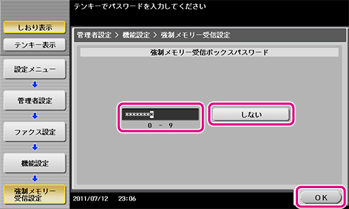 4 [しない] をタップし、ボックスに保存したファクスを操作するためのパスワードをテンキーで入力し、