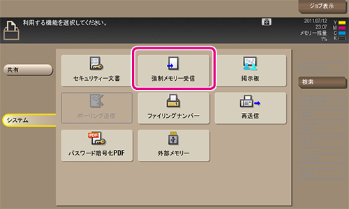 3 [ファクス設定] - [機能設定] - [強制メモリー受信設定] を選びます。
