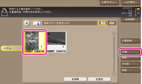 ファクスが印刷され、強制メモリー受信ボックスから自動的に削除されます。
