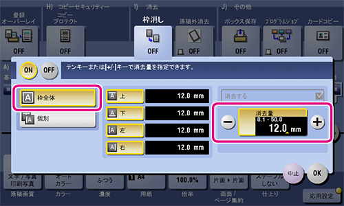 5 原稿の4辺をすべて同じ幅で消去する場合は、[枠全体] をタップして、[ + ] [ - ] で幅を指定します。