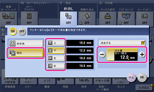 6 消去する幅を上下左右で個別に指定する場合は、[個別] をタップして辺を選び、[ + ] [ - ]で幅を指定します。