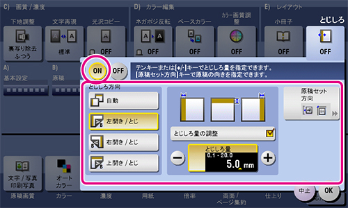 4 [ON] をタップし、とじしろの各項目を設定します。