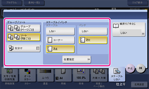 | [位置指定] | ステープルとパンチの位置を設定します。 ※ [自動] に設定すると、セットした原稿の向きに合わせて、ステープルおよびパンチ位置が自動的に設定されます。 |