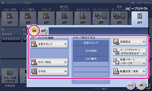 4 [ON] をタップし、コピープロテクトの各項目を設定します。