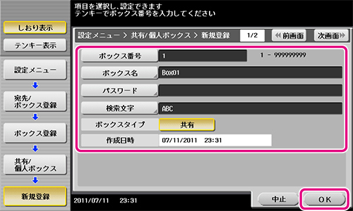 | [ボックス名] | ボックス名を入力します。 半角20文字、全角10文字まで入力できます。 |