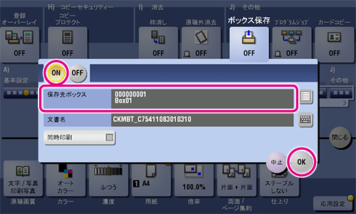 4 [ON] をタップし、[保存先ボックス] で保存するボックスを選んで、[OK] をタップします。