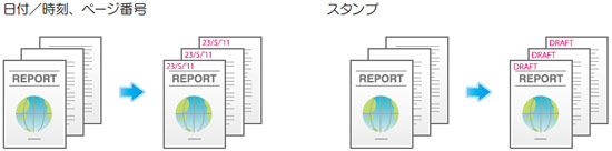 回覧、社外秘などの文字や、日付、ページ番号を付けてコピーできます。