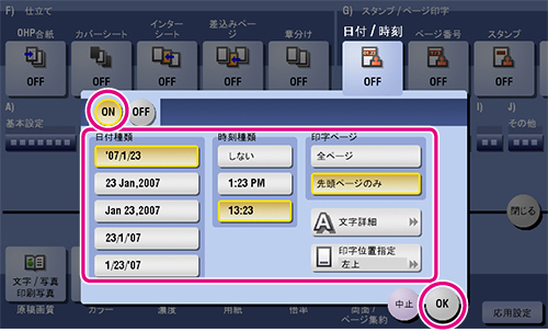 4 [ON] をタップして、[日付種類]、[時刻種類]、[印字ページ] を設定し、[OK] をタップします。
