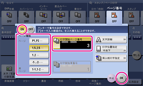6 [ON] をタップして、[ページ種類]、[印字開始ページ番号] を設定し、[OK] をタップします。