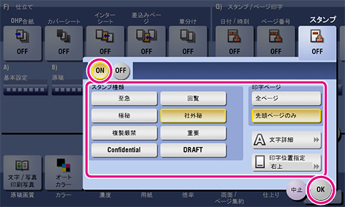 8 [ON] をタップして、[スタンプ種類]、[印字ページ] を設定し、[OK] をタップします。