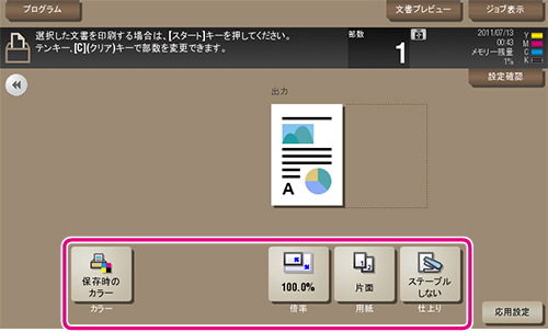 変更できる設定は、[カラー]、[倍率]、[両面/ページ集約]、[仕上り] です。