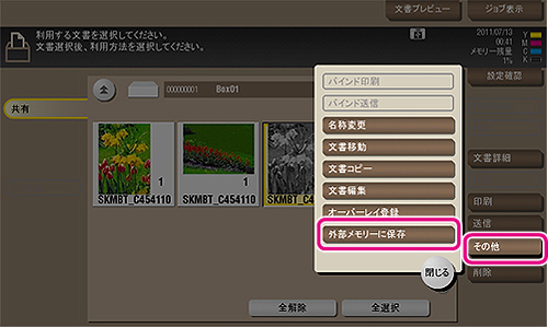 6 ファイルを外部メモリーに保存する場合は、保存するファイルを選び、[その他] をタップして、