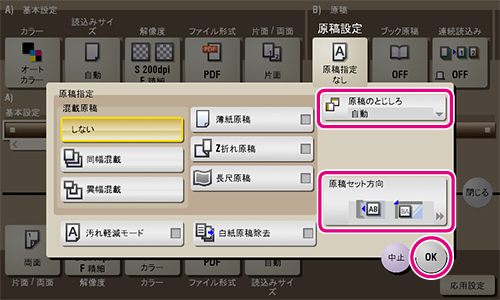 5 セットした両面原稿に合わせて、[原稿のとじしろ] と[原稿セット方向] を設定し、[OK] をタップします。