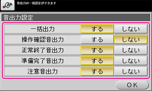 | [操作確認音出力] | 操作パネルやタッチパネルを操作したときに、音を鳴らすかどうかを設定します。 |