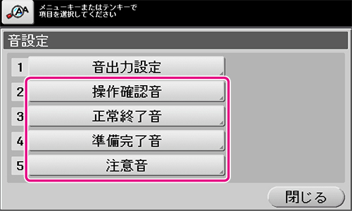 2 キー操作音などを鳴らすかどうかを設定する場合は、[音出力設定] を選び、各音を鳴らすか鳴らさないかを設定します。