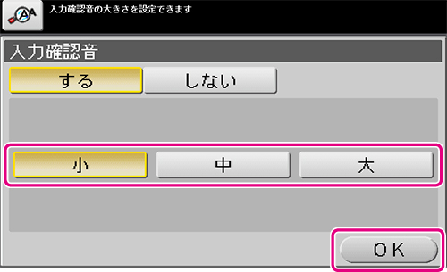 | [入力無効音] | 操作パネルやタッチパネルのキーを押したが無効だったときの音量を設定します。音量は大/中/小から選びます。 | |