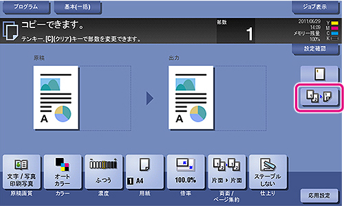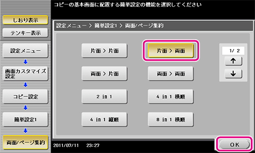2 [画面カスタマイズ設定] - [コピー設定] -[簡単設定1]/[簡単設定2] を選びます。