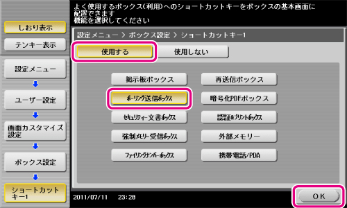 2 [画面カスタマイズ設定] - [ボックス設定] -[ショートカットキー1]/[ショートカットキー2]を選びます。