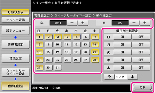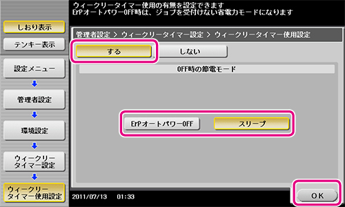3 [環境設定] - [ウィークリータイマー設定] -[ウィークリータイマー使用設定] を選びます。