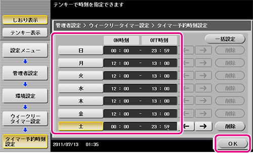 6 ウィークリータイマーを設定する曜日を選び、ON時刻とOFF時刻をテンキーで入力して、[OK] をタップします。