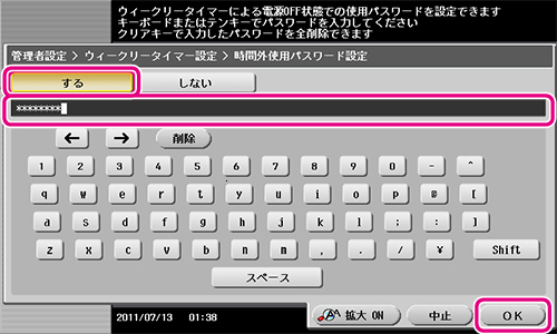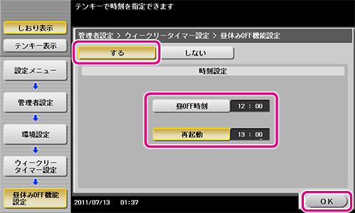 10 [する] を選び、節電モードに切換える時間帯をテンキーで入力して、[OK] をタップします。