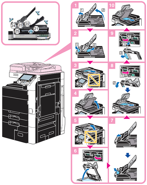 原稿送り装置(以下ADF)の原稿給紙トレイに残っている原稿を取り除いた後、原稿給紙トレイを持ち上げて詰まっている用紙を取り除いてください。