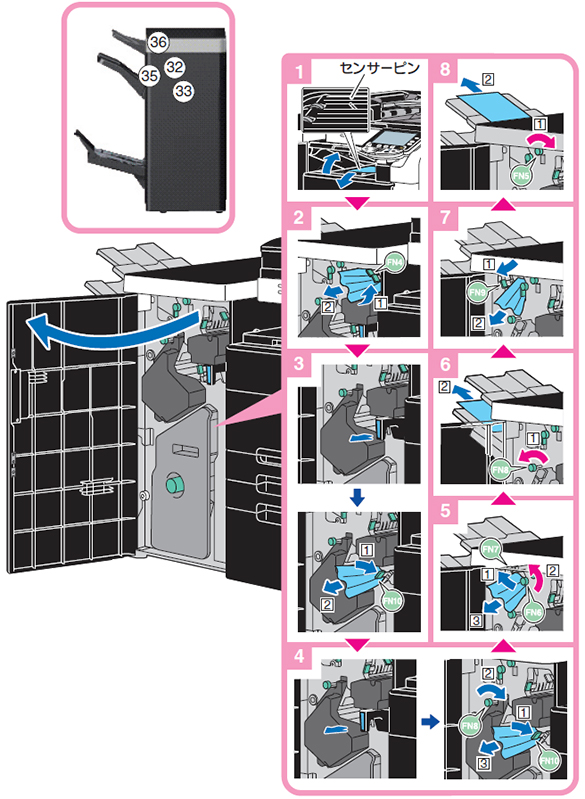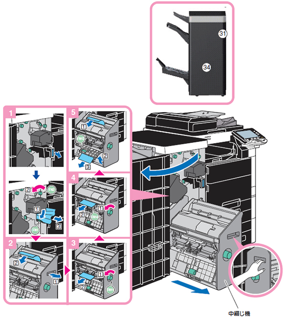 オプションのフィニッシャーFS-526に中綴じ機SD-508、パンチキットPK-516を装着場合は、下図の手順で詰まった用紙を取り除いてください。