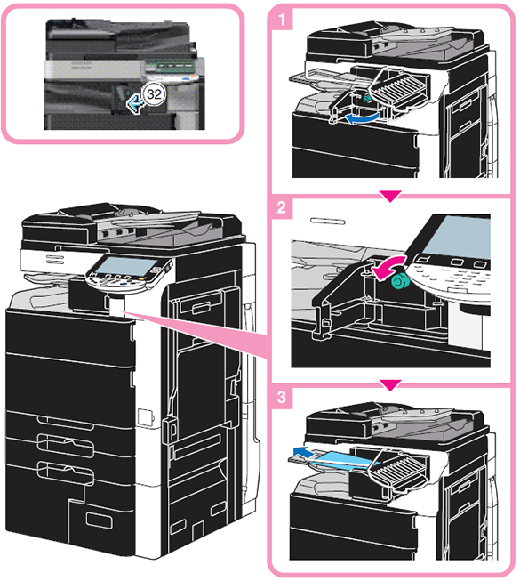 下図の手順に従って詰まった用紙を取り除いてください。