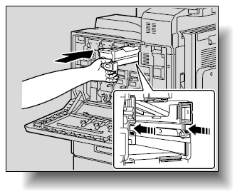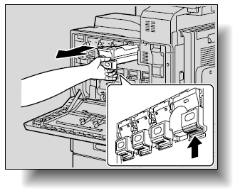 他の色のトナーカートリッジは取り付け位置が異なります。また、他の色のトナーカートリッジは取り付けることができないようになっています。無理に取り付けようとすると故障の原因になりますのでご注意ください。