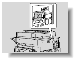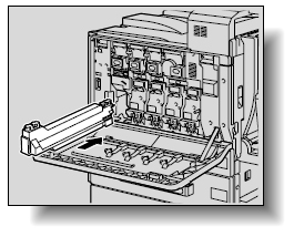 本機の前ドアを開けて、廃棄トナーボックス解除レバーを押します。