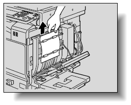 本機の両面ユニットドアを開き、詰まっている用紙をゆっくりと引き抜いてください。