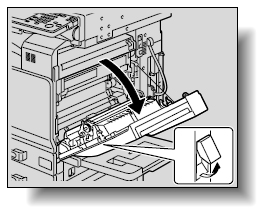 本機の右上ドア解除レバーを引いて右上ドアを開き、詰まっている用紙をゆっくり引き抜いてください。
